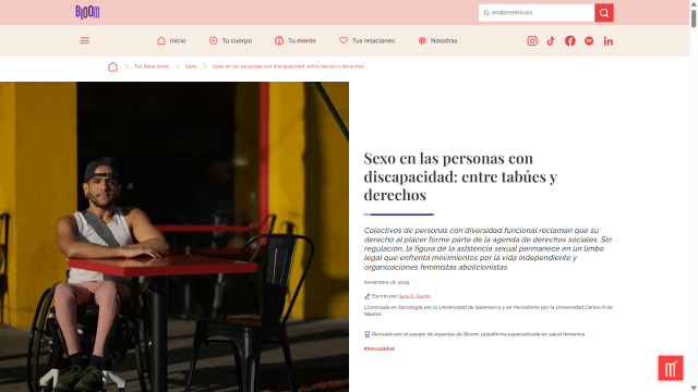 Este mes tuve la suerte de charlar con la periodista Sara G. Pacho y aportar mi visión como profesional de la Terapia Feminista a su artículo en BeBloomers, titulado “Sexo en las personas con discapacidad: entre tabúes y derechos”. Fue una conversación profunda y necesaria, porque habla de algo que muchas veces se invisibiliza y que, para mí, es urgente reivindicar que la sexualidad de las personas con discapacidad no es un privilegio, sino un derecho.